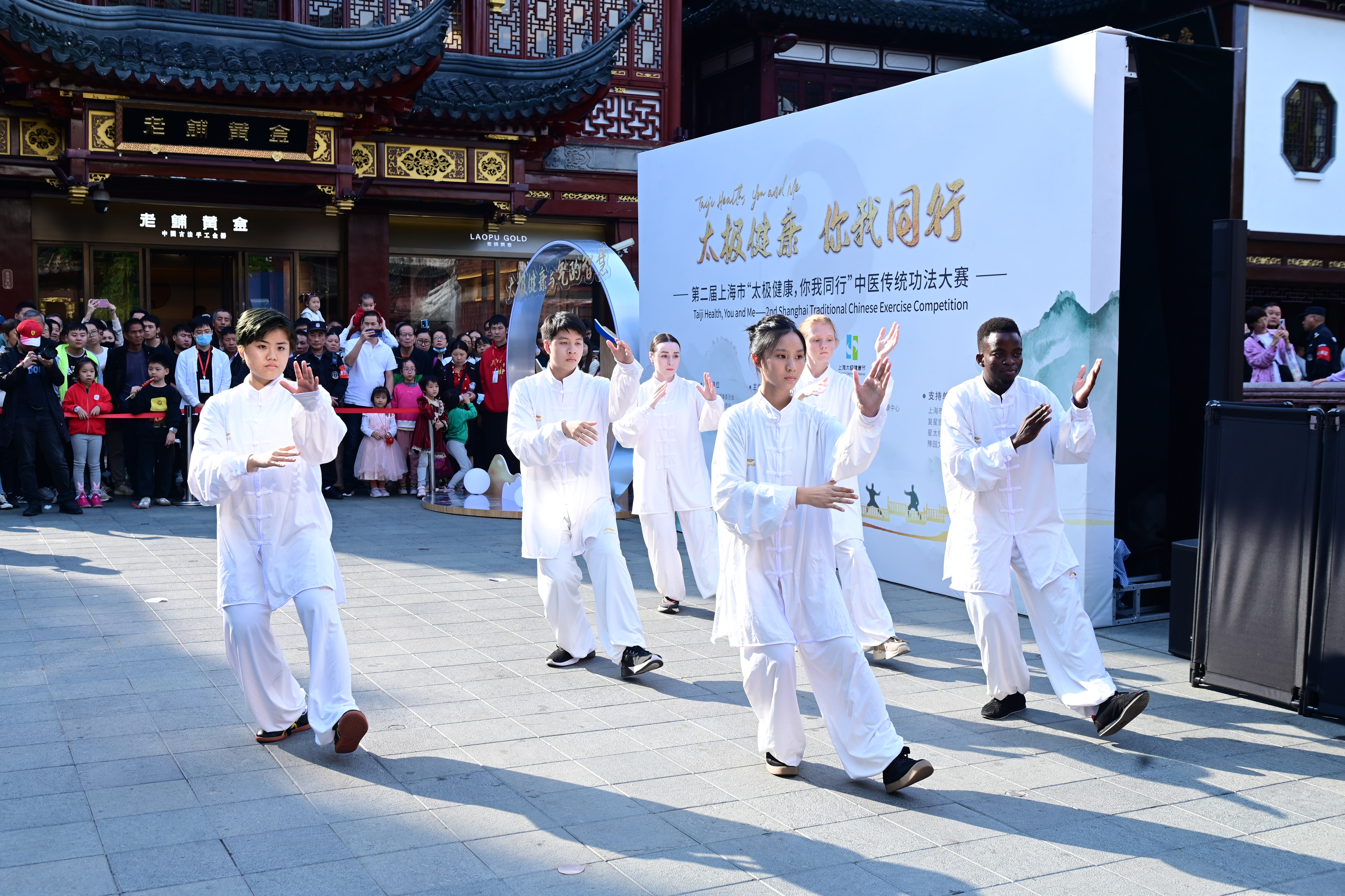 今天的海派文化地标豫园九曲桥广场游人如织,近处豫园的亭台楼阁与远处楼群摩天的陆家嘴交相辉映,在传统与现代的连接点,上海气功研究所气道书院外籍学员团队、伟德国际victor1946官网附属闵行蔷薇小学“五行操”团队以及复星集团旗下星太极进行传统功法展演,并与游客分享太极文化,体验非遗太极拳的抱手礼,一同感受优秀传统文化的魅力。