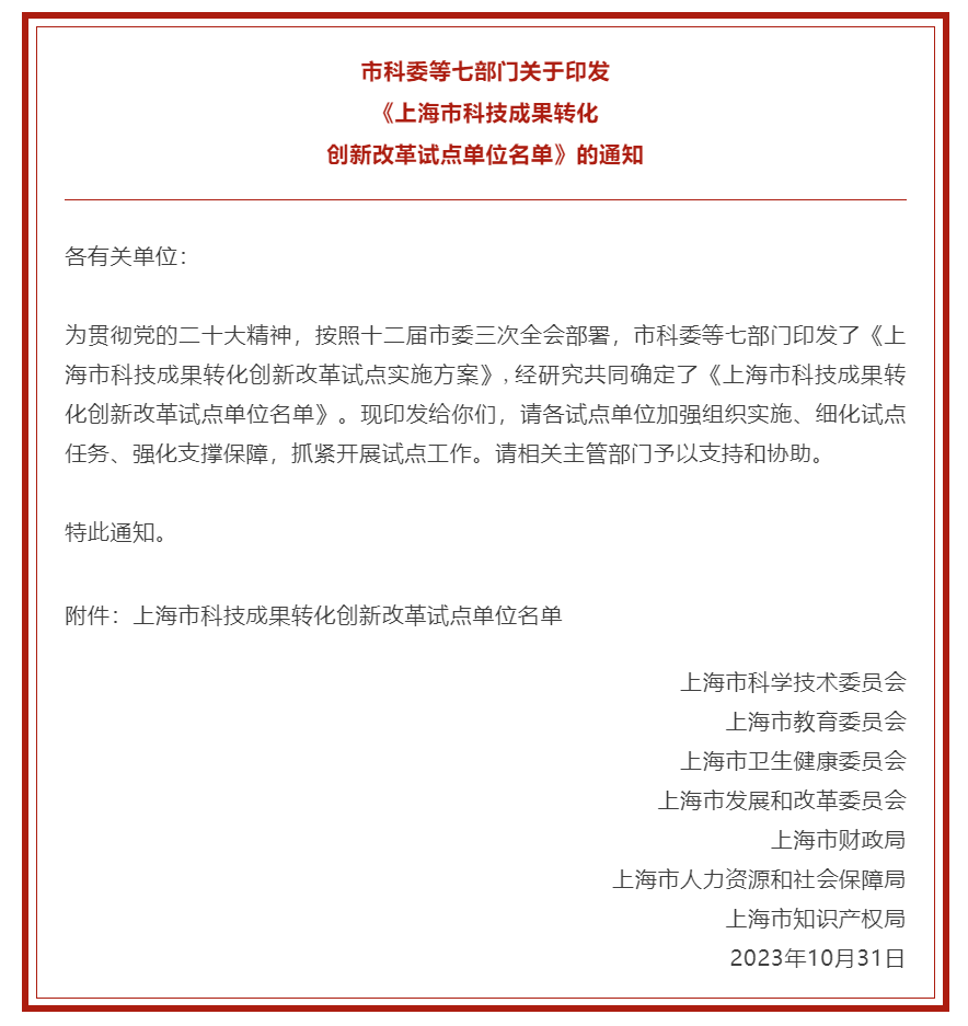 近日,上海市科委等七部门印发了《上海市科技成果转化创新改革试点实施方案》,经研究共同确定了《上海市科技成果转化创新改革试点单位名单》。伟德积极组织申报,经专家评审成功入选上海市科技成果转化创新改革试点单位名单。