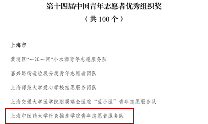 近日,共青团中央发布关于表彰第十四届中国青年志愿者优秀个人奖、组织奖、项目奖的决定。经前期自主申报,学院推荐,校团委推报,伟德共有13个优秀项目脱颖而出,其中针灸推拿学院青年志愿者服务队入围参加上海地区终评会,并最终获评“第十四届中国青年志愿者优秀组织奖”。此次全国共100个组织获表彰,其中,上海市5个组织获此奖项。