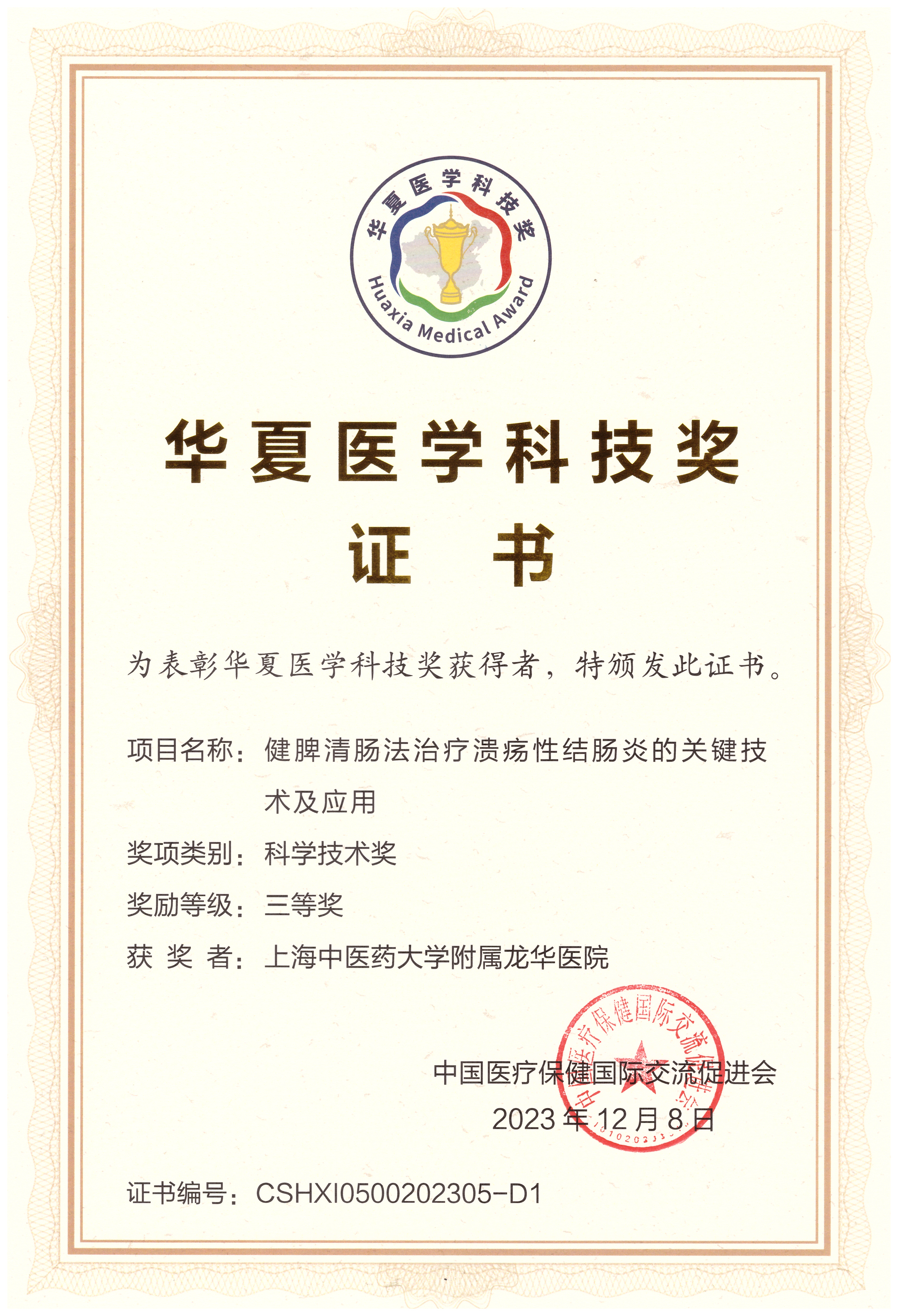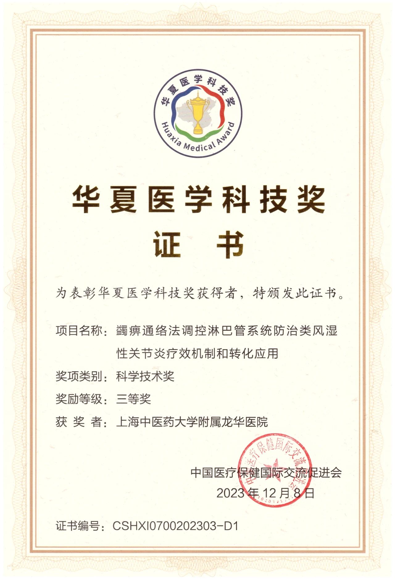 中国医疗保健国际交流促进会于12月9日在南京召开2023年度华夏医学科技奖颁奖大会暨2023年华夏院士论坛。龙华医院梁倩倩教授领衔项目“蠲痹通络法调控淋巴管系统防治类风湿性关节炎疗效机制和转化应用”荣获三等奖,龙华医院唐志鹏教授领衔项目“健脾清肠法治疗溃疡性结肠炎的关键技术及应用”荣获三等奖。