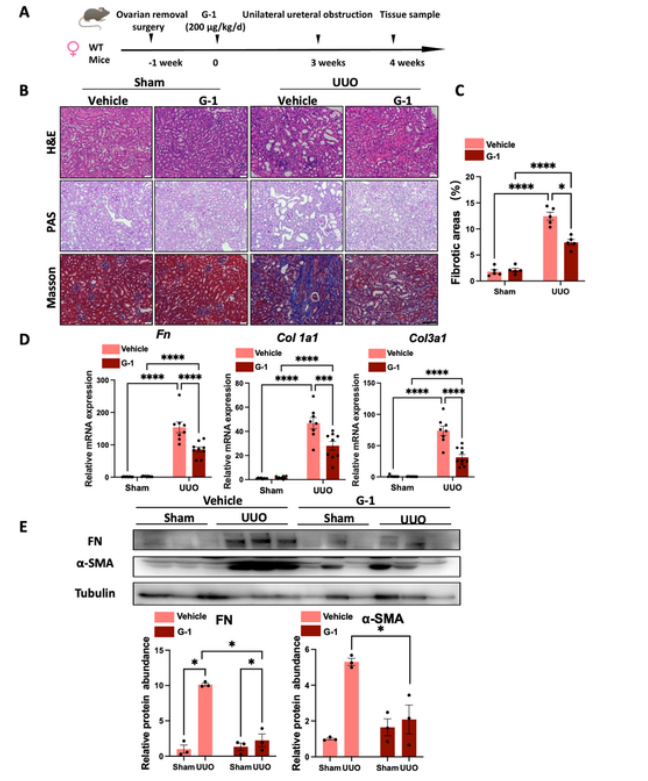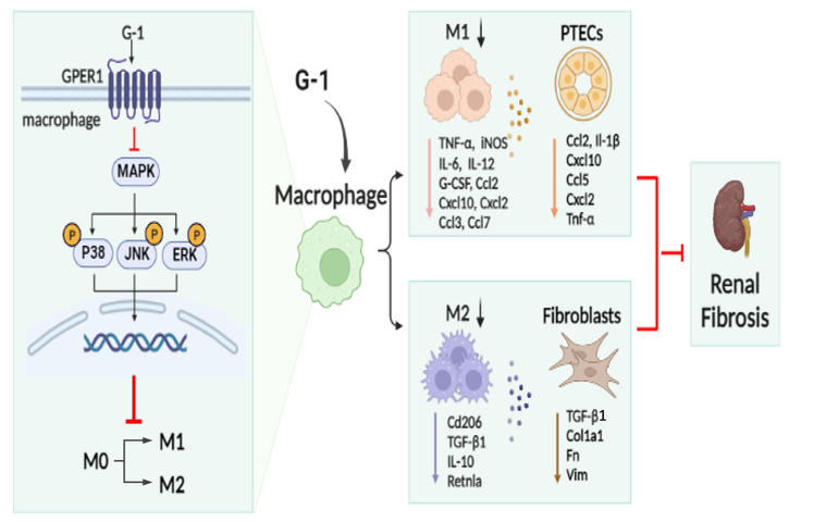 研究结果表明,在单侧输尿管梗阻(UUO)去势雌性小鼠或雄性小鼠肾纤维化模型中活化GPER1,通过抑制巨噬细胞向M1型或M2型极化,从而阻遏肾纤维化进展;反之,敲除Gper1则加重UUO小鼠肾纤维化;随后,体外细胞研究进一步证实,活化GPER1可通过调控MAPK通路,从而阻遏M0型巨噬细胞向M1型或M2型巨噬细胞极化。这些研究结果强调巨噬细胞中GPER1在肾纤维化进展中的重要作用。