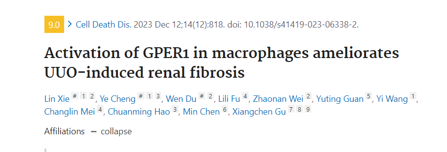 岳阳中西医结合医院肾内科副主任医师顾向晨/主任医师陈敏团队长期从事肾纤维化发病和阻遏机制的研究,近日,在巨噬细胞促成肾纤维化进展中的作用与机制的研究取得新进展。相关成果Activation of GPER1 in macrophages ameliorates UUO- induced renal fibrosis发表于《细胞死亡与疾病》(Cell Death & Disease)。
