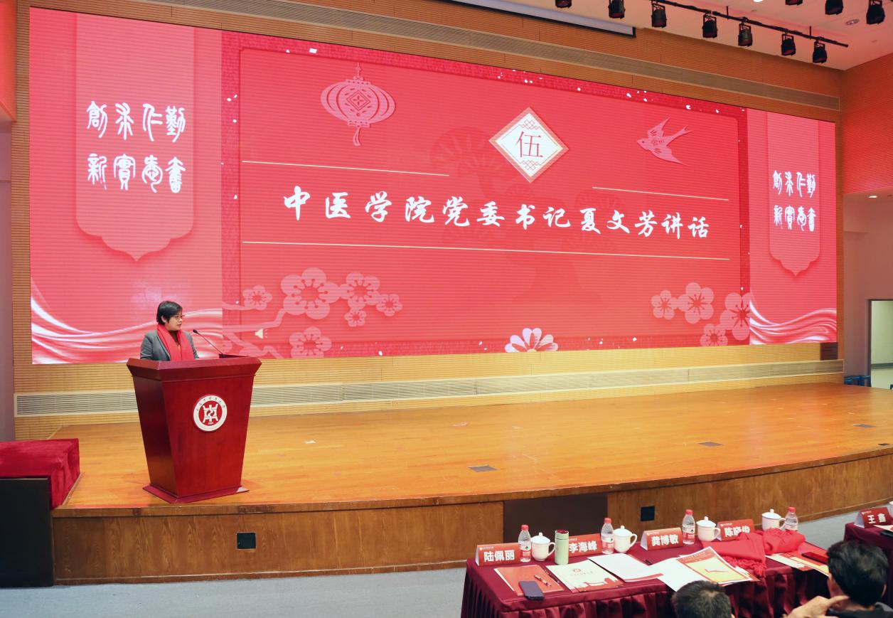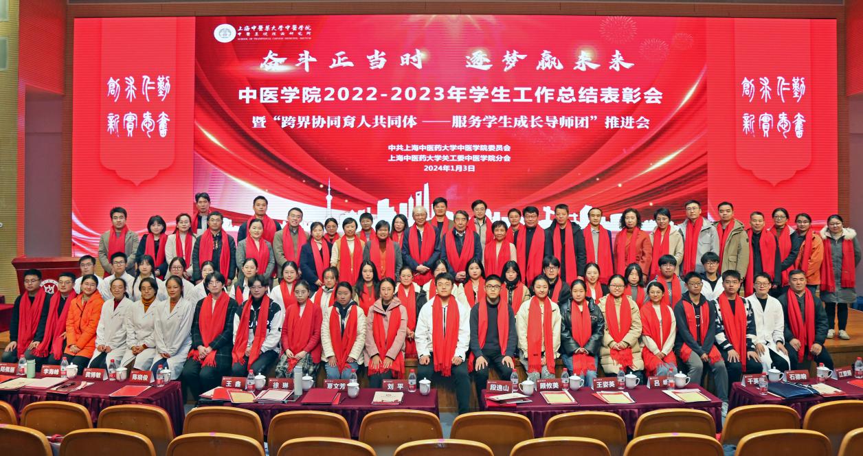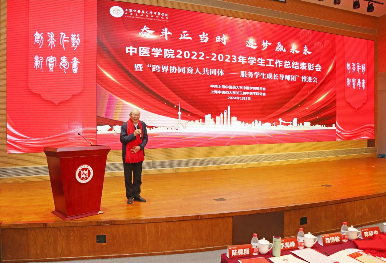 新年伊始,中医学院以一场接地气、聚人气、冒热气的学生工作大会谋新篇、开新局、聚新力。1月3日,中医学院2022-2023年学生工作总结表彰会暨“跨界协同育人共同体——服务学生成长导师团”推进会在图书馆裙楼四楼报告厅举行。学校“生生”导师团团长、终身教授段逸山,杏林春华导师团团长、终身教授刘平,仁术合一导师团团长、退休党委副书记顾攸美受邀出席大会。学校相关职能部门,图书馆、上海中医药博物馆、体育部等党建共建单位,上海市档案馆、陈云纪念馆等合作单位的相关同志,青年教师班主任、辅导员、家长代表、全体在校生参加会议。中医学院党委副书记陆佩丽主持会议。
