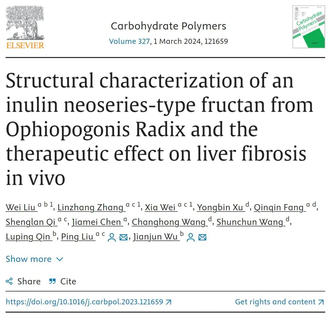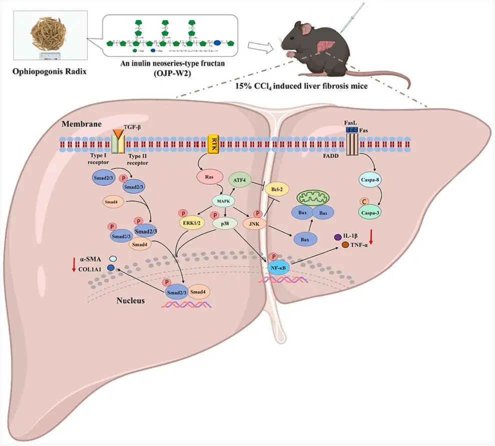 伟德国际victor1946官网附属曙光医院肝肾疾病病证教育部重点实验室刘平教授团队联合浙江中医药大学药学院吴建军团队,于2023年12月4日在Carbohydrate Polymers杂志在线发表了题为Structural characterization of an inulin neoseries-type fructan from Ophiopogonis Radix and the therapeutic effect on liver fibrosis in vivo的研究论文,报道了从浙产中药麦冬中分离出的均一性菊糖型果聚糖OJP-W2可通过调节TGF-β/Smads和MAPK信号通路抑制HSC活化、肝脏炎症及肝细胞凋亡,从而改善四氯化碳诱导的肝纤维化小鼠模型。