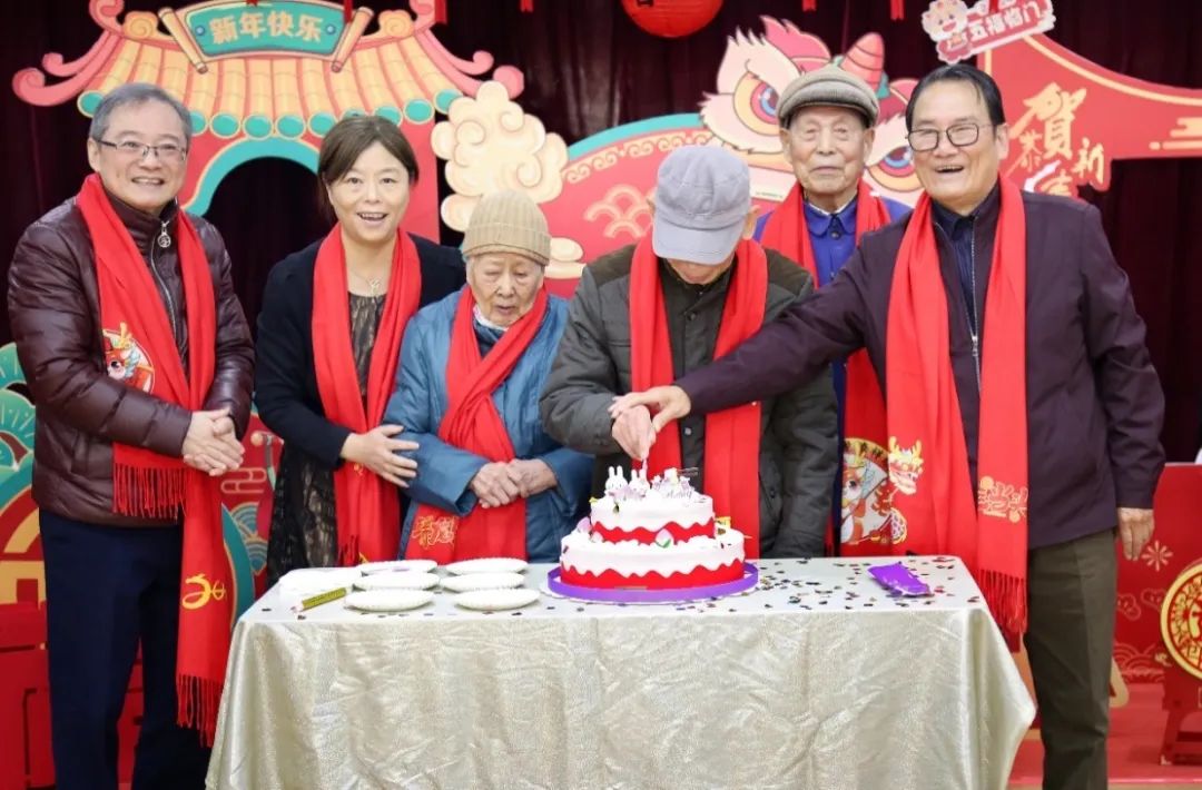 朱惠蓉、张建中、张智强陪同离休干部一起切祝福新年的蛋糕,大家为老干部集体祝寿,祝福他们健康长寿。