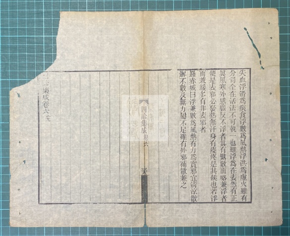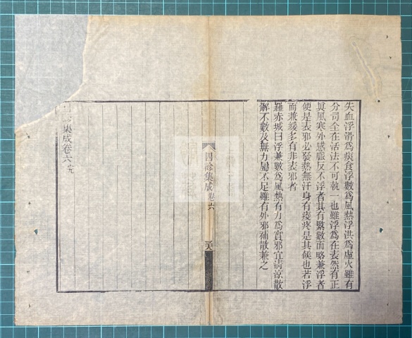 《四诊集成》是清代吕绍元编纂的一部诊法类中医著作,原书共四册,卷一至卷三为望诊;卷四为望诊、闻诊、问诊;卷五至卷八为切诊。全书内容广泛,四诊齐全,论述精辟。图书馆所藏版本为清道光二十年(1840年)双遂堂藏板刻本,是一部孤本中医药典籍。修复前该书破损病害情况主要包括:虫蛀、磨损、撕裂、老化、断线等现象。正式修复之始,古籍数字化工作人员在修复前对该书进行逐页扫描留存书影,再由古籍修复师对古籍破损情况分析研究,利用高精度电动厚度仪、无水酸碱度检测仪器,完成纸张厚度、pH值酸碱度等定量测试分析。在馆藏十余种纸张中,选配了材质、颜色及厚度相对接近的竹皮纸,作为修复补纸。然后制定最终修复方案,建立修复档案,以保证珍贵古籍文物安全。修复过程遵循“整旧如旧”原则,达到修复流程科学规范化。修补采用传统手工纸修补技法,环节包括打浆糊、编码、拆书、配纸、揭书叶、书叶去污、溜书口、补书叶、喷水倒平、折页、修边、捶平、压实、齐栏、订纸捻钉、裁切、打磨、装书皮、锥书眼、穿线等20多道工序,妥善解决了古籍存在的病害,最大限度保存古籍历史信息,达到预期目的。