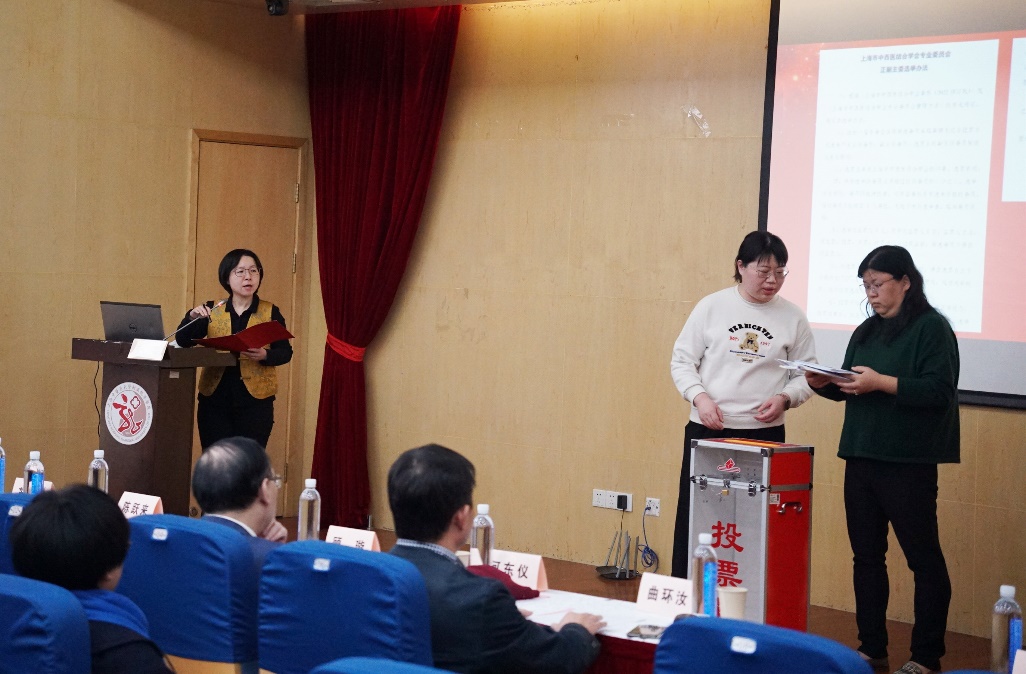 第四届上海市中西医结合学会风湿病专委会秘书姜婷向大会汇报了第五届风湿病专业委员会换届改选筹备的情况。随后,于芸宣读《第五届风湿病专业委员会组成人员的批复》,大会产生了第五届风湿病专业委员会60名委员及20名青年委员,龙华医院曲环汝主任当选主任委员,薛鸾、潘新、朱琦、万伟国、赵福涛当选副主任委员,魏强华、陈薇薇等10人当选常务委员,周珺担任常务委员及秘书,特聘苏励、苏晓、管剑龙、屠文震等10位名老专家担任顾问,何东仪担任专委会名誉主任委员。