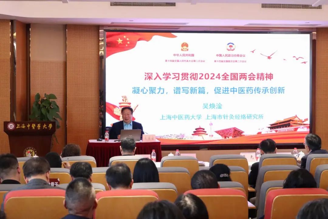 吴焕淦讲解了十四届全国人大二次会议的基本情况、政府工作报告主要内容,重点传达习近平总书记在全国两会期间的一系列重要讲话精神,还介绍了他向大会提交的《关于推动中医针灸治疗慢性病、促进人民健康的建议》等5份建议,分享了16年来坚持在两会舞台上助力中医药传承创新的经历和成效。
