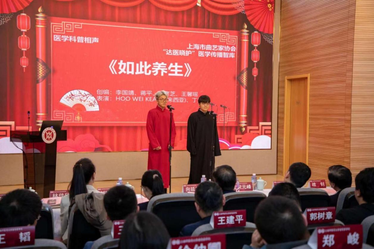 此外,上海交通大学医学院的两位学生还带来了精彩的科普相声表演《如此养生》。值得一提的是,其中一位演员是在华留学生,来自马来西亚。两位同学生动展示了医学传播学的教学成果。