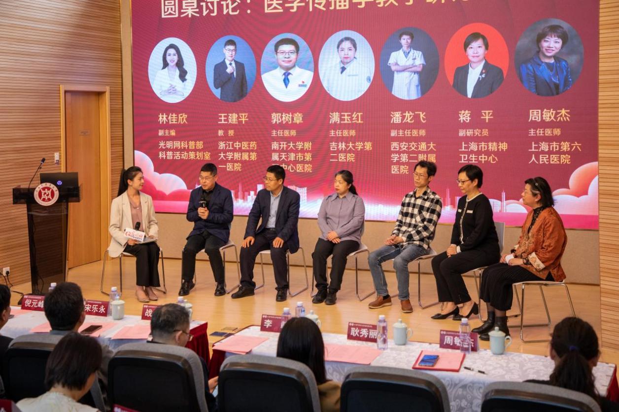 在圆桌讨论环节,与会专家围绕“医学传播学教学研讨与展望”主题进行了深入探讨和交流。浙江中医药大学附属第一医院王建平教授、南开大学附属天津市第三中心医院主任医师郭树章、吉林大学第二医院主任医师满玉红、西安交通大学附属医院主任医师潘龙飞、上海市精神卫生中心副研究员蒋平、上海市第六人民医院主任医师周敏杰六位专家参与讨论。