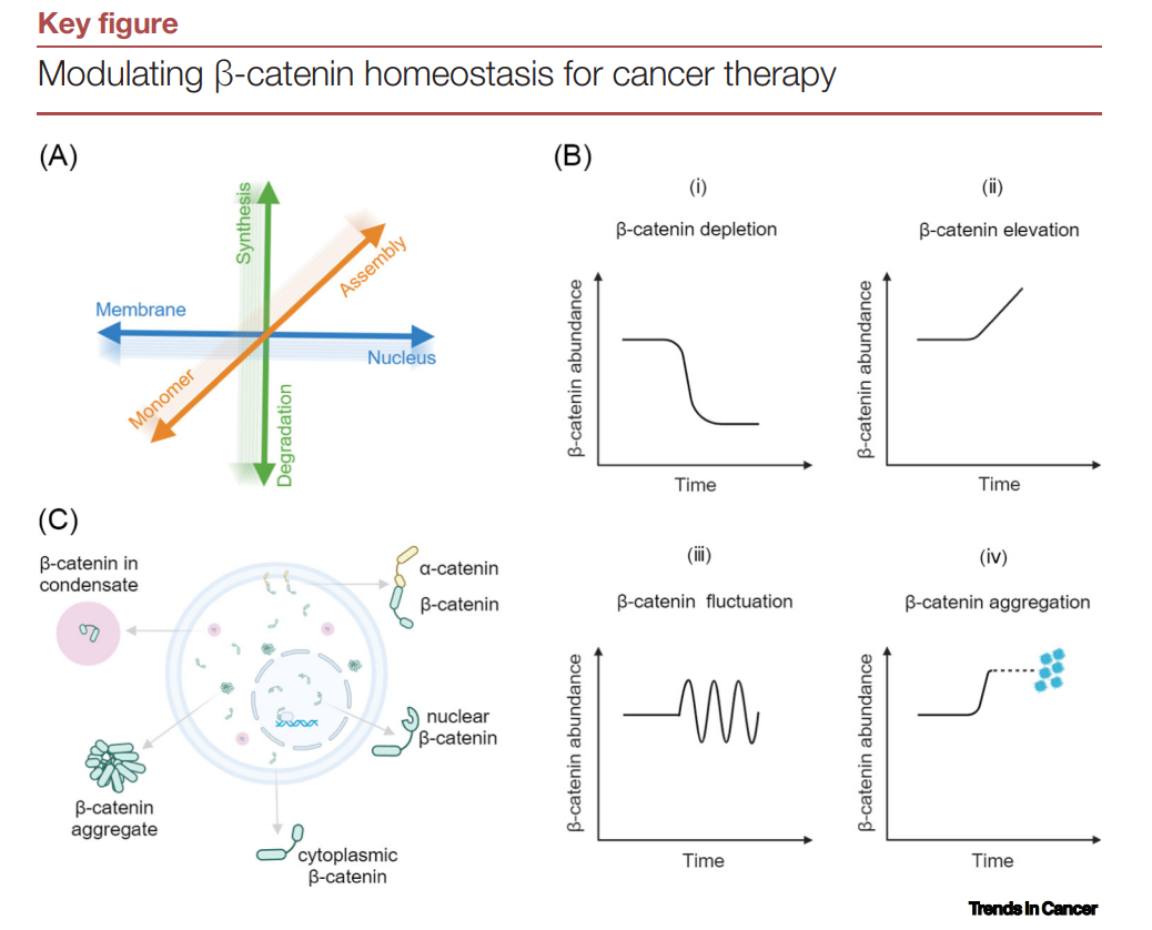 在该论文中,作者基于前期的针对β-catenin的靶向抗肿瘤药物研究(Wang B, et al, Cell Reports, 2022;Yan R, et al, Cell Reports, 2022;Cui C, et al, Trends in Biochemical Sciences, 2018)以及本领域的最新进展,提出β-catenin蛋白存在时间(time)、空间(compartmentalization)和尺度(size)等三个维度上的稳态(homeostasis)。在时间维度上,β-catenin的稳态主要是蛋白生成速率和降解速率之间的平衡;在空间维度上,β-catenin的稳态主要是其在细胞膜、细胞质和细胞核中的动态平衡。另外,β-catenin还存在单体(monomer)与复合体(assembly)之间的交换,即尺度稳态。β-catenin复合体可以是相分离凝聚体(condensate),或蛋白聚集体(aggregate)等。值得注意的是,β-catenin这三种稳态之间存在相互交叉和动态平衡。在生理状态下,β-catenin稳态的维持是其功能所必需,如果β-catenin稳态被改变,细胞或者被诱导凋亡,或者达到一个新的稳态,导致细胞功能改变。因此,所有β-catenin的病理性改变都可以归结为β-catenin稳态的改变和重塑,打破肿瘤细胞中β-catenin的稳态有望获得靶向抑制β-catenin依赖肿瘤的目的。由于β-catenin在结构上是一种典型的“不可靶向”蛋白,开发药物靶向调控β-catenin三维稳态有望规避直接靶向β-catenin的众多挑战,是一种极具吸引力的策略。作者认为,基于蛋白三维稳态开发靶向药物,同样可以适用到其他“不可靶向”的肿瘤驱动因子。