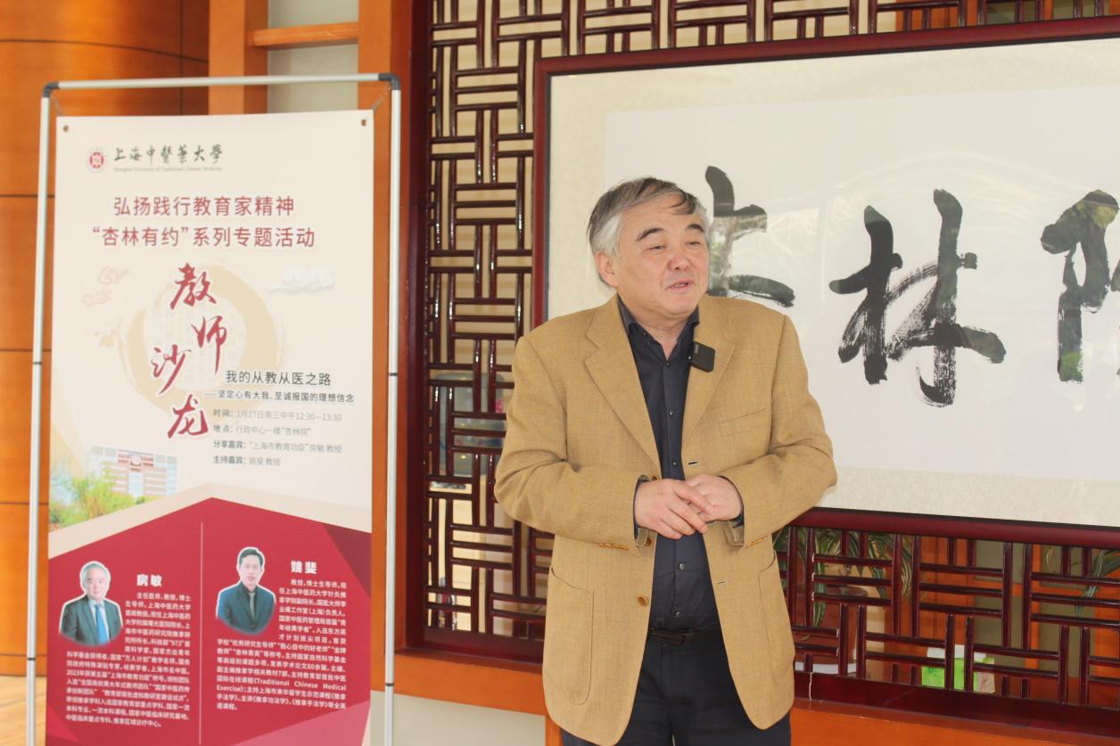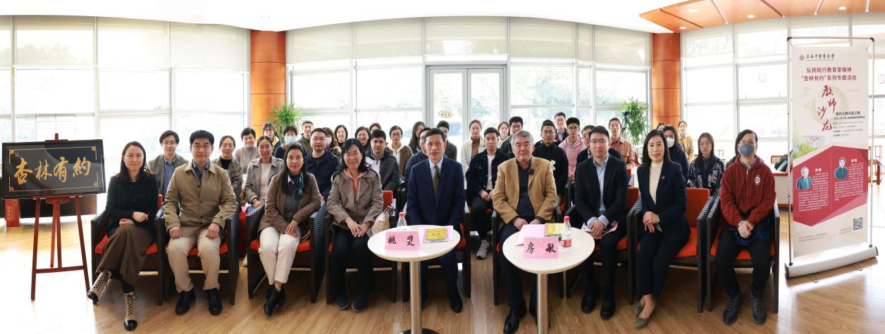 为巩固拓展学习贯彻习近平新时代中国特色社会主义思想主题教育成果,始终做习近平新时代中国特色社会主义思想的坚定信仰者和忠实实践者,通过深入学习贯彻习近平总书记关于“大力弘扬教育家精神”的重要指示精神,赓续初心,争做新时代的“大先生”。3月27日中午,“杏林有约”教师沙龙在行政中心一楼杏林院举办。活动以“我的从教从医之路:坚定心有大我、至诚报国的理想信念”为主题,特邀“上海市教育功臣”曙光医院院长房敏教授、“我心目中的好老师”针灸推拿学院副院长姚斐教授,与参会师生进行分享交流。校党委副书记沈辉、宣传部(党委教师工作部)部长陶思亮,以及各二级学院青年教师、学生代表等40余人参加活动。活动由党委教师工作部副部长刘虹主持。