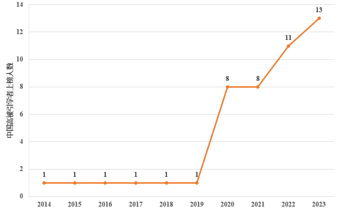 2023年爱思唯尔“中国高被引学者”伟德上榜13人,人数连年增加!