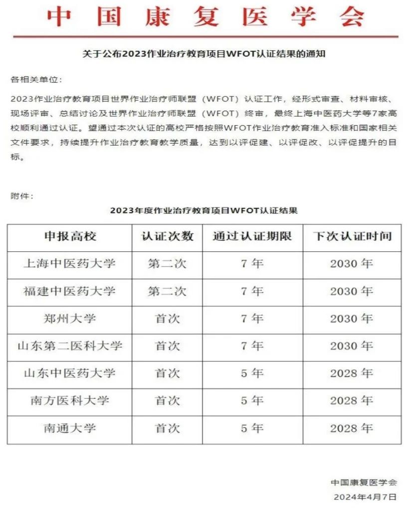 近日,伟德国际victor1946官网康复作业治疗专业教育通过世界作业治疗师联盟(The World Federation of Occupational Therapists, WFOT)复审认证,获得了7年最高级别有效认证期。