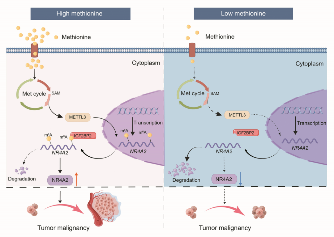 Met的促癌功能正日益受到重视。故Met限制性饮食已被用于抗肿瘤的临床前研究以及临床试验研究中。但是,Met作为一种人体必需氨基酸,对肌肉组织和神经系统非常重要。Met限制性饮食会造成体重减轻等副作用。因此,发现和鉴定受Met调控的下游关键促癌基因并用作新型抗肿瘤靶点,有助于克服Met限制性饮食带来的风险。本研究发现Met通过“SAM-METTL3-RNA m6A-IGF2BP2”这一新型调控轴来诱导ESCC细胞中的NR4A2表达,而NR4A2对Met的促癌功能不可或缺,故靶向干预NR4A2可作为替代Met限制性饮食的抗肿瘤新策略。