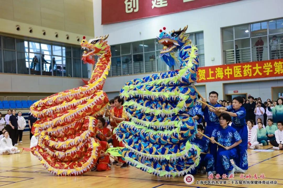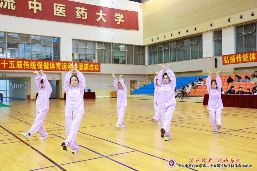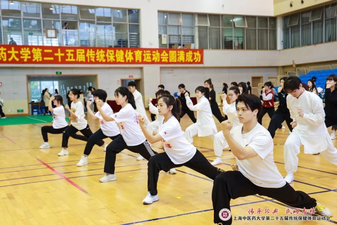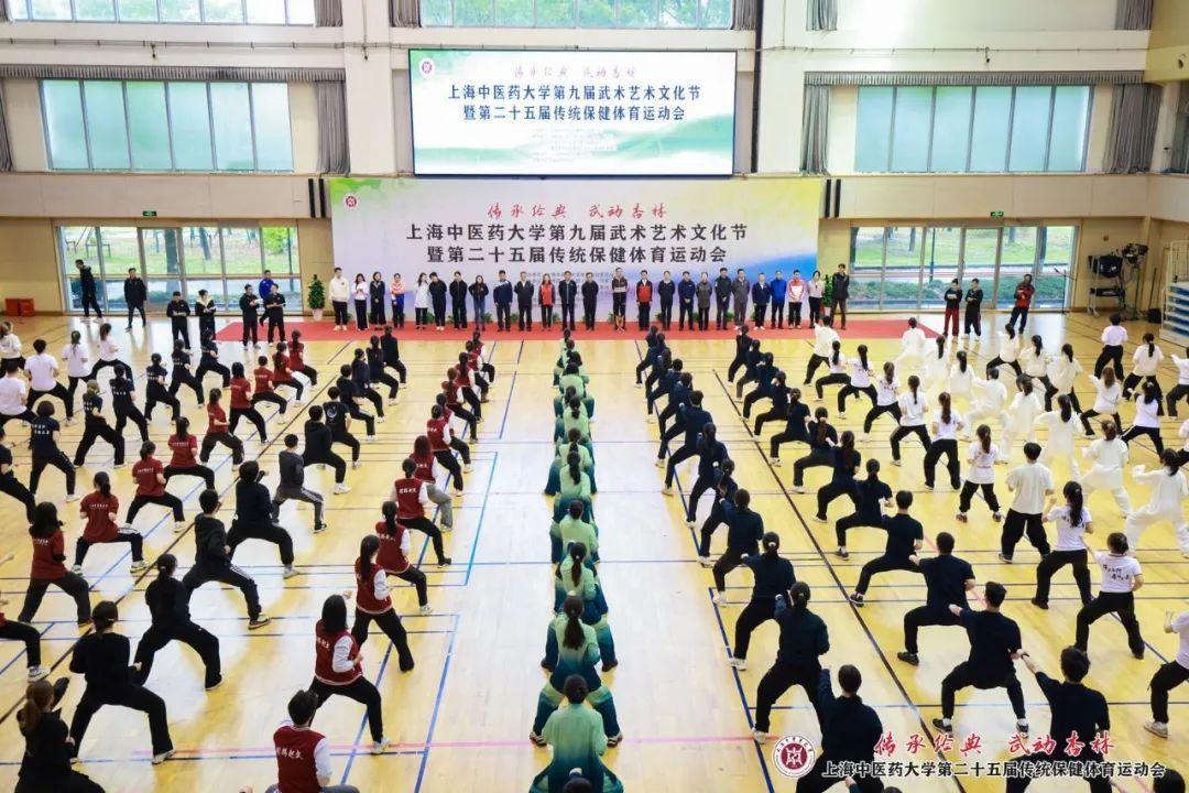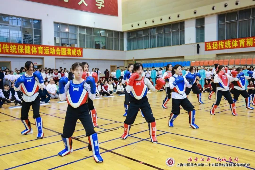 开幕式上的舞龙、武术、健美操、散打、短兵等体育教学项目展示,充分展现了杏林学子们青春飞扬、拼搏奋斗的精神面貌。八段锦集体展示与比赛是本轮赛事的首场比赛,也是伟德传统保健体育运动会的特色项目。八段锦是当下青年人热衷打卡的健身运动,此次八段锦展示共有全校26支班级代表队参加,几百人同练,气势非凡。各班级整齐划一、动静相宜、刚柔并济的动作展示,充分彰显出传统体育文化的魅力与上中医学子的自信与情怀。