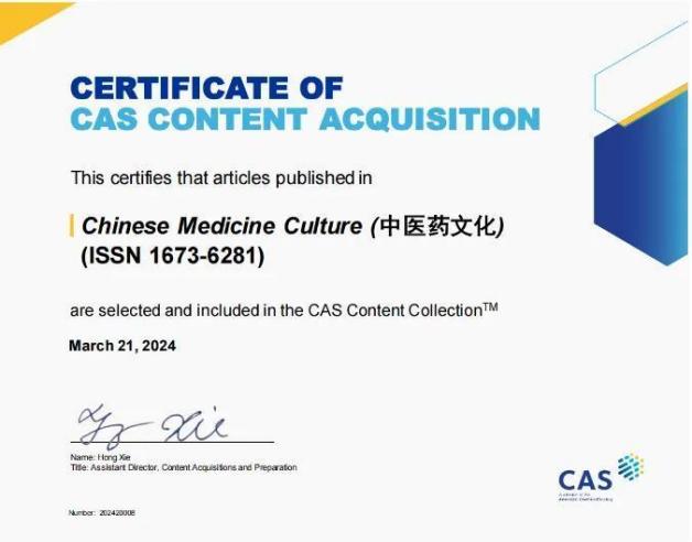 近期,《中医药文化》(ISSN 1673-6281)、《中医药文化(英文版)》(ISSN 2589-9627)正式被美国化学文摘社(Chemical Abstracts Service, CAS)数据库收录,即将上线。这标志着两本期刊的国际影响力和学术水平得到进一步的认可。