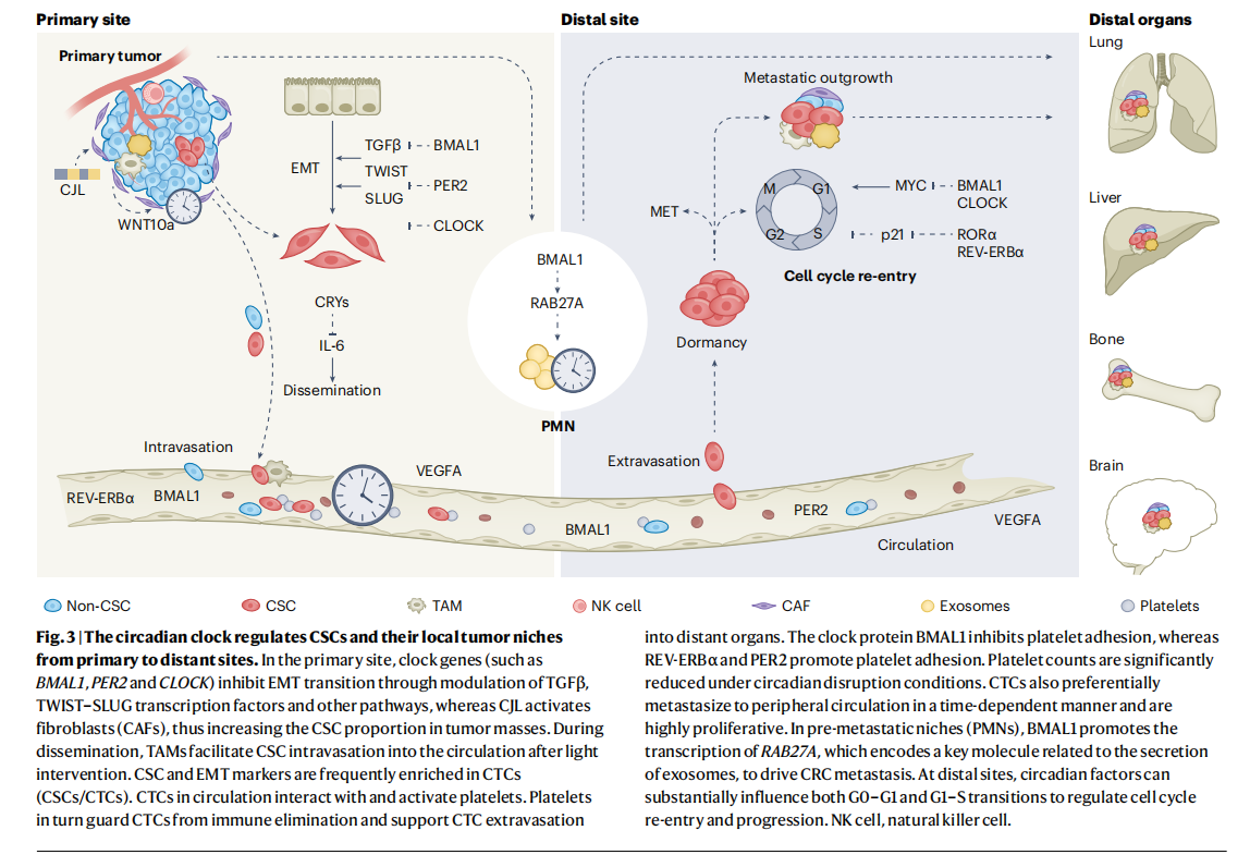 近日,伟德国际victor1946官网中西医结合学院和附属曙光医院联合新加坡Agency for Science, Technology and Research(A*STAR)研究所在国际著名期刊Nature子刊Nature Cancer发表论文,题为Circadian regulation of cancer stem cells and the tumor microenvironment during metastasis。文章系统回顾了生物钟是如何在肿瘤转移的不同阶段通过干预肿瘤干细胞及其周围的肿瘤微环境调控肿瘤转移的。通过干预昼夜节律靶点消除肿瘤驻留干细胞,抑制肿瘤转移,增强免疫治疗反应可能是未来研究的热点。