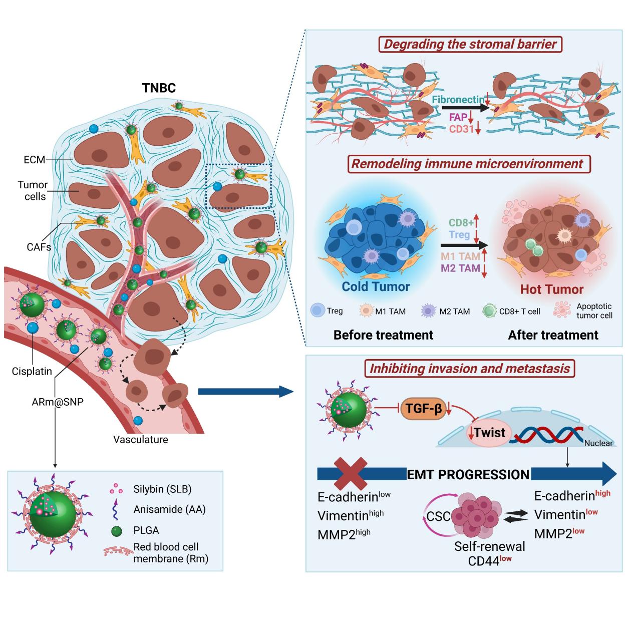 在该研究中,将ARm@SNP作为靶向CAFs的“纳米矛”,与Cis联用后,通过破坏CAFs在促进4T1肿瘤发生发展过程中所构成的三重“盾”,进而引起4T1肿瘤生长停滞:抑制血管生成和纤维连接蛋白的表达来瓦解基质屏障;影响TGF-β/Twist/EMT通路,阻碍EMT活化,抑制4T1细胞的侵袭和转移;增加免疫活性细胞的活性和浸润来逆转免疫抑制微环境。综上,基于CAFs靶向功能,ARm@SNP在体外改善了4T1细胞对Cis的耐药性,在体内提高了Cis对4T1荷瘤小鼠的治疗效果的同时,重塑了肿瘤微环境,抑制了4T1肿瘤进一步侵袭转移,为三阴性乳腺癌的治疗提供了新的思路。