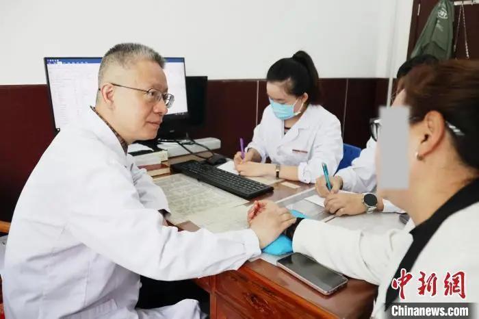 图为上海援青医疗人才、青海省中医院医务科副主任张圣宏为患者把脉。张添福摄