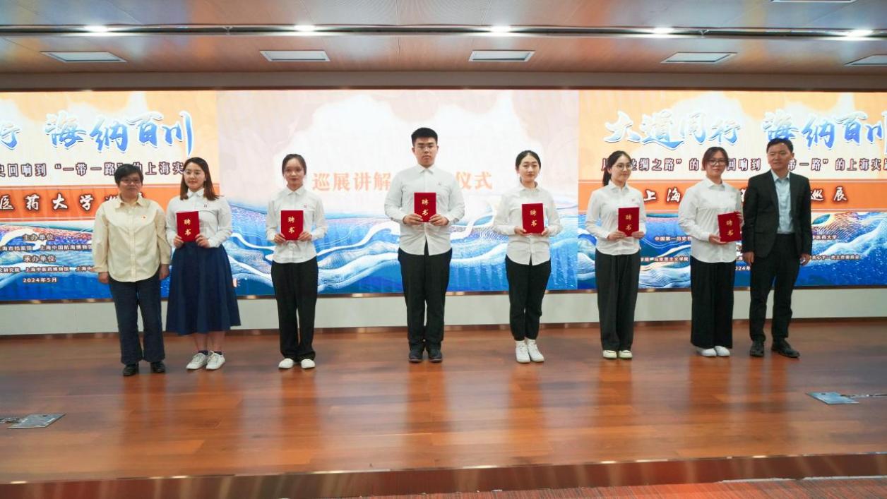 中医学院“生生”文化讲师团带来“文化强国新征程 中医青年勇担当”的现场朗诵,表达中医学子听党话、跟党走,努力传承精华、守正创新,弘扬中医药文化瑰宝的决心。“此次展览,我认为不仅是对‘丝绸之路’历史的一种传承,更是对‘一带一路’倡议的生动诠释。将‘大道同行,海纳百川’展览引进校园,对我们青年学生有深远的教育意义。”2022级中医学(屠呦呦班)贾炎枚说道。