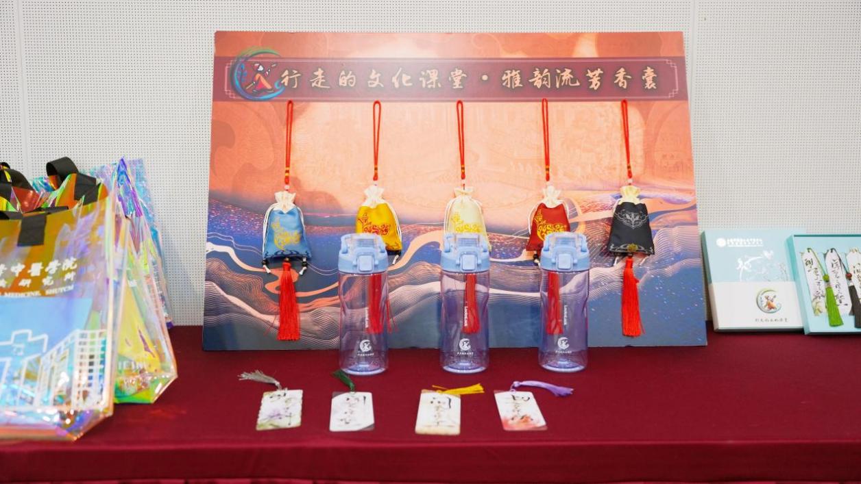 “行走的文化课堂”以展促创,以研发文创作品的方式,将文物的深度、历史的厚度、文明的广度融入中医药文化的“双创”行动。活动现场,一系列由学生团队研发的文创产品亮相。“行走的文化课堂”徽标生动描绘了一位书童右手持扇,左手点墨,行走在广袤的祖国大地上的特色形象。学生团队还延伸设计了带有徽标的水杯,体现中医望闻问切诊法思维的“四诊书签”,由上海市名中医、学校终身教授王庆其组方配伍的基于中医“五行学说”的“雅韵流芳香囊”等,无不展现中医药文化的深邃雅致,在年轻一代心中播下对中医药文化的热爱与传承的种子。