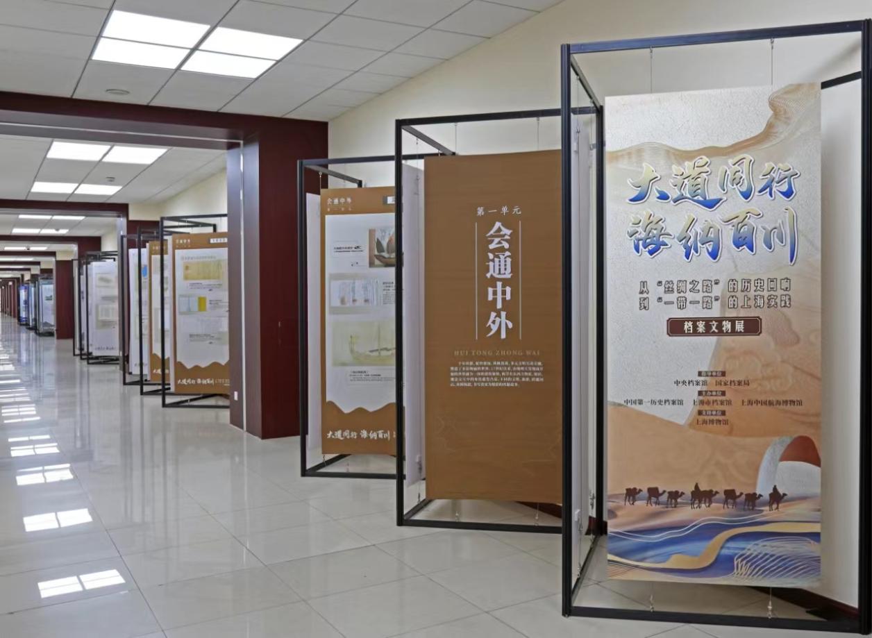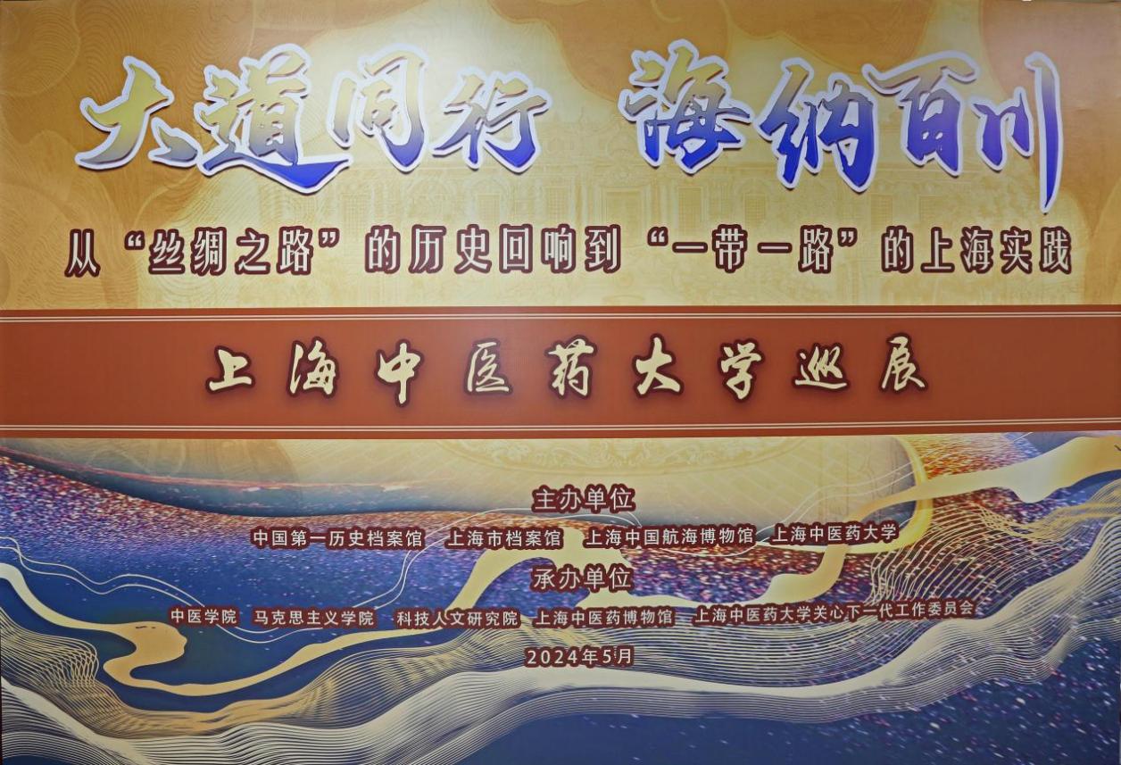 据悉,“大道同行 海纳百川——从‘丝绸之路’的历史回响到‘一带一路’的上海实践”档案文物展于2023年12月在上海市档案馆新馆正式对外展出。该展览由中央档案馆、国家档案局指导,由上海市档案馆、中国第一历史档案馆、中国航海博物馆共同举办。本次巡展通过“会通中外”“和合四方”“风气之先”“幸福之路”四大板块,运用250余件(组)档案、照片、文物,展示了绵亘万里、延续千年的古丝绸之路的灿烂文明,新时代共建“一带一路”的壮美画卷,以及上海作为“一带一路”桥头堡的十年硕果。该项目入选第23届上海市社会科学普及活动周项目。本次巡展将在伟德8号教学楼四楼持续展出至9月,由中医学院组建的讲解员队伍为校内外师生提供“菜单式”“互动式”宣讲。