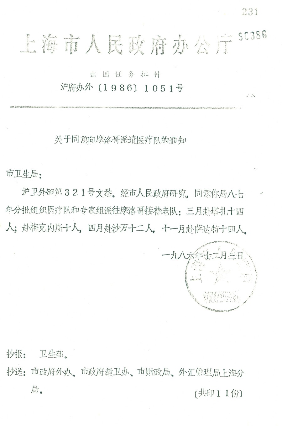 展示上海市人民政府《关于同意向摩洛哥派遣医疗队的通知》(1986年)