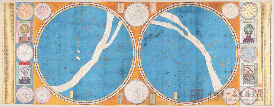 《赤道南北两总星图》明崇祯七年(1634年)明崇祯朝改定历法,该图由礼部尚书、文渊阁大学士徐光启主持,传教士汤若望、罗雅谷等人合作完成。木印彩绘,为8条幅纵向拼合,是17世纪世界最为完备的星图。(中国第一历史档案馆藏)