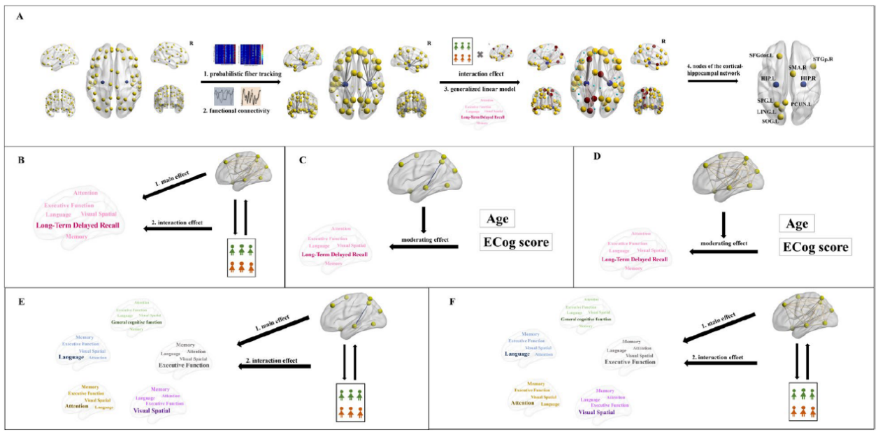 随着人口老龄化形势日益严峻,痴呆的发生率也越来越高。从正常认知状态发展到痴呆是一个连续的过程。在这个过程中,遗忘型轻度认知障碍(amnestic mild cognitive impairment,aMCI)是重要过渡阶段,其年平均发病率约为3.79%,且发展为临床痴呆的可能性更高,年转化率约为10%-15%,因此,在神经调控领域,研发针对aMCI的神经调控新策略,有助于改善症状、延缓病情进展、预防痴呆发生。目前,经颅磁刺激技术在改善神经系统疾病导致的功能障碍方面显示出巨大潜力,然而,传统的神经调控靶点聚焦于单个脑区,未能充分考虑神经网络的整体性和复杂性。徐建光教授团队认为神经环路和网络在认知过程中发挥着关键作用,创立了mapping神经环路的新技术。该研究包含了73例遗忘型轻度认知障碍患者和58例健康参与者的多模态磁共振和全套神经心理学量表数据,先进行概率性纤维追踪,再计算功能连接,最后,使用广义线性模型分析功能连接与记忆量表得分的关系,结果显示,“皮质-海马”网络内的功能连接与长延时回忆得分相关,可作为神经调控的潜在刺激靶区。