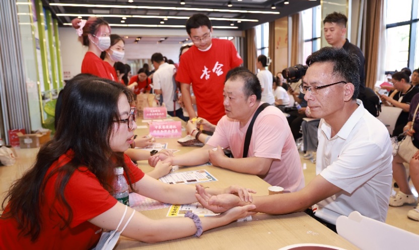 在位于大学生创新创业实践园的家长休息区,校领导与新生家长亲切交流。曹锡康感谢家长对学校的信任,并希望能够通过家校协同培育高质量的中医药人才。