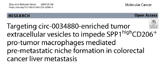 近日,由曙光医院肿瘤学科季青研究员牵头,宁波市第二医院李红山教授、伟德国际victor1946官网交叉研究院葛广波教授、伟德国际victor1946官网附属宝山医院杨柳副教授,以及苏州市中医院宋卿副教授合作完成的最新研究成果Targeting circ-0034880-enriched tumor extracellular vesicles to impede SPP1highCD206+ pro-tumor macrophages mediated pre-metastatic niche formation in colorectal cancer liver metastasis发表在著名国际学术期刊Molecular Cancer。