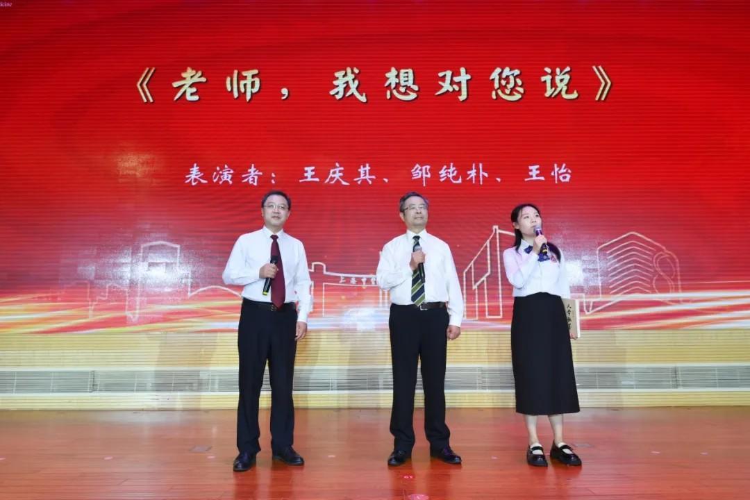 5位青年教师联袂演唱系列快闪歌曲《上学歌》《开往清晨的午夜》《追光者》《最美的太阳》,为所有教师送上节日的温馨祝福,拉开教师节庆祝大会的序幕。