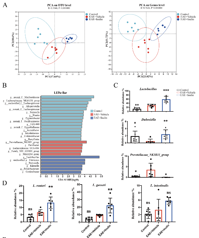 多发性硬化症(MS)是一种以中枢神经系统(CNS)炎性脱髓鞘为特征的自身免疫疾病。自身免疫性脑脊髓炎小鼠(EAE)是MS的经典模型,该工作以EAE小鼠为研究对象,率先明确了从中药牡蒿中分离纯化出的菊糖预防性给药或治疗性给药均可以有效改善CNS炎性脱髓鞘病变。发生在外周免疫器官的T细胞介导的免疫反应,尤其是Th17细胞的激活,在MS病人和EAE小鼠的炎性脱髓鞘病变中发挥着重要作用。该研究发现菊糖给药后显著抑制了EAE小鼠中枢神经系统和淋巴结中的Th17细胞激活,但是Ex vivo实验中菊糖并不能抑制髓鞘蛋白MOG35-55诱导的淋巴细胞再反应性增殖。肠道菌群测序结果表明给予菊糖的EAE小鼠菌群结构发生明显变化,特别是乳杆菌(包括罗伊氏乳杆菌、鼠李糖乳杆菌等)含量显著升高,另外GC-MS检测发现粪便和血清丁酸盐含量上升。粪菌移植实验证实菊糖处理过的小鼠粪便内容物对EAE小鼠症状有改善作用,与此一致,丁酸盐可以抑制MOG35-55刺激的淋巴细胞的活化。相反地,抗生素清除削弱了菊糖对EAE小鼠的症状和自身免疫应答的影响,而补充罗伊氏乳杆菌则恢复了菊糖的治疗效果。这些结果证实,菊糖对EAE小鼠Th17细胞和炎性脱髓鞘的抑制作用取决于其对肠道微生物群和代谢产物的调节作用。该研究揭示了中药来源的菊糖型多糖调控菌群和代谢抑制中枢神经系统自身免疫反应的机制,为进一步理解中医药发挥整体免疫调控作用的物质基础和药理机制提供了依据。