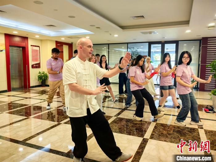 美国籍留学生周安带领国际学生缓缓起势,打起太极拳。