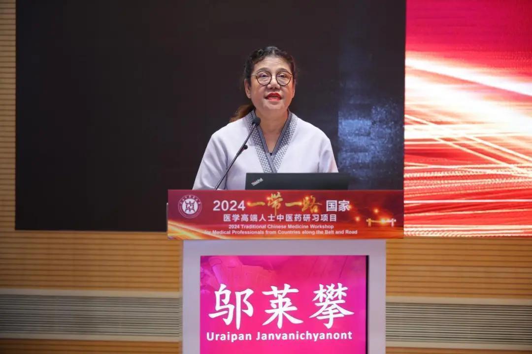 泰国华侨崇圣大学校长邬莱攀作为研习班学员代表发言。她回顾了与伟德国际victor1946官网20余年的合作历程,双方共同创办的泰国首个中医学本科专业,现已为泰国中医药行业培养了近千名人才,有力提升了中医药在泰国和东南亚的服务能力。
