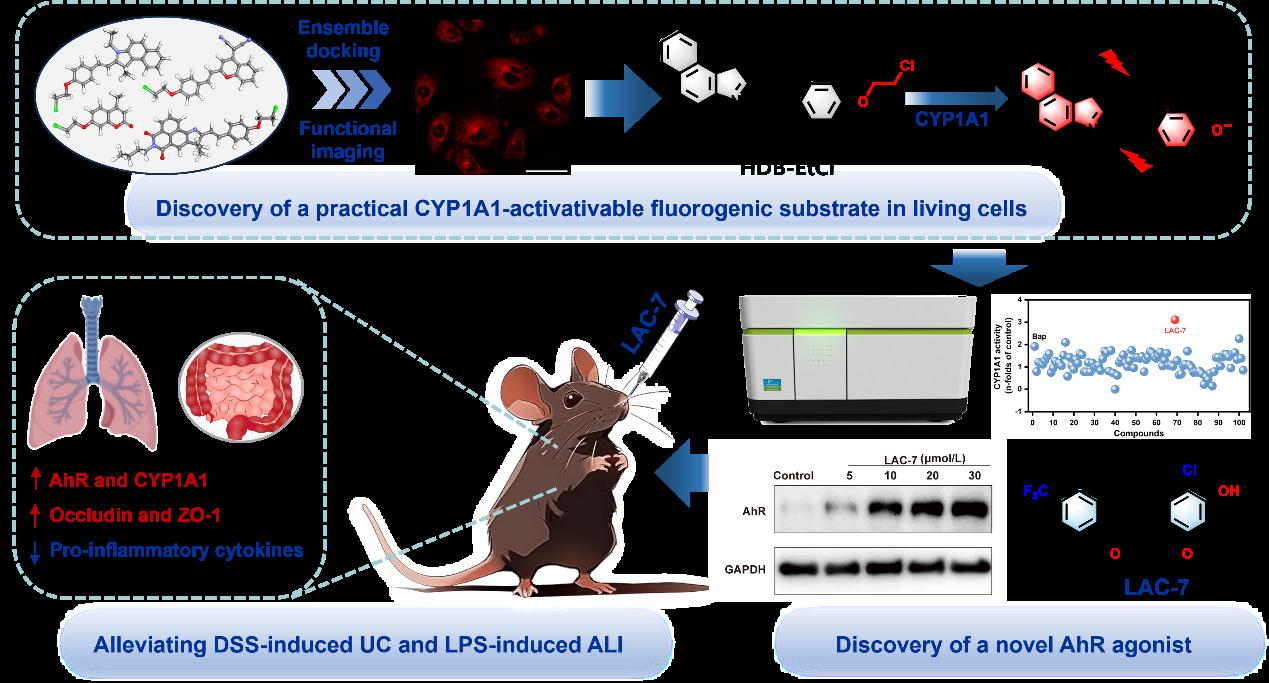 针对上述科学问题,伟德葛广波教授团队结合分子理性设计和基于活细胞的荧光底物筛选策略,构建了一种高效、实用的CYP1A1功能原位成像分析新方法,并将其用于AhR-CYP1A1轴调控剂的高效发现和精准评价。作者首先通过系综对接和细胞功能成像分析,发现了一种亚型特异性高、细胞膜通透性好且可用于活细胞长时程成像分析的CYP1A1荧光底物(HDB-EtCl)。该荧光底物可用于多种活细胞及组织切片中CYP1A1的功能成像分析。研究团队借助该荧光底物构建了适于活细胞的CYP1A1功能原位成像分析新方法,并将其与AhR萤光素酶报告基因法联合用于高效发现AhR-CYP1A1轴的调控剂。通过对自建化合物库的规模化筛选,团队发现了一种新型的AhR-CYP1A1轴强效激活剂LAC-7。LAC-7可在多种细胞系中显著上调CYP1A1和AhR的表达水平,还可通过抑制巨噬细胞M1极化,降低LPS诱导的骨髓来源巨噬细胞(BMDMs)中炎症因子的水平。安全性研究发现连续14天口服高剂量LAC-7没有导致小鼠死亡,且未观察到血液毒性、器官损伤或明显异常。组织分布显示LAC-7在小鼠肠道中高暴露,其次在肺组织中也有较高暴露。体内试验表明,LAC-7能显著缓解DSS诱导的小鼠溃疡性结肠炎和LPS诱导的小鼠急性肺损伤,明显降低多种炎症因子的水平,显著增加模型组小鼠肠和肺组织中紧密连接蛋白的表达水平,恢复屏障系统的完整性。综上所述,该研究通过开发基于活细胞的药物筛选新方法,实现了复杂生物体系中CYP1A1酶活的原位功能成像分析,极大地促进了AhR-CYP1A1轴调节剂(新型抗炎候选药物)的高效发现和精准评价。