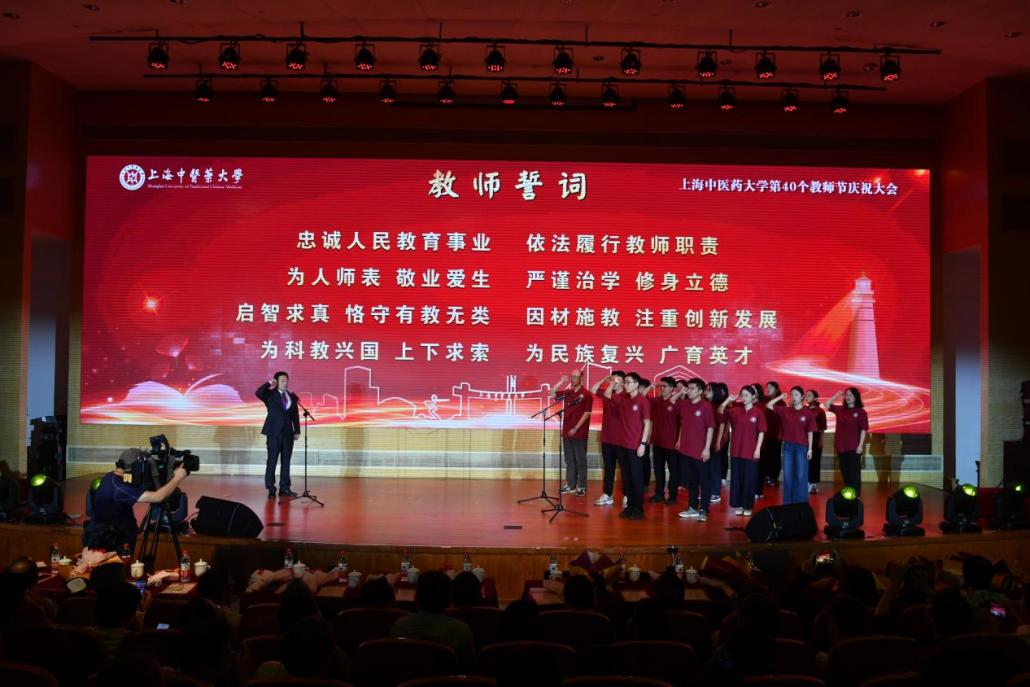 在全场师生的见证下,从教三十年教师代表李医明教授带领新进教师代表,完成了庄严而神圣的教师宣誓仪式。新教师们面对校徽,庄重宣誓,忠诚人民教育事业、为民族复兴广育英才。