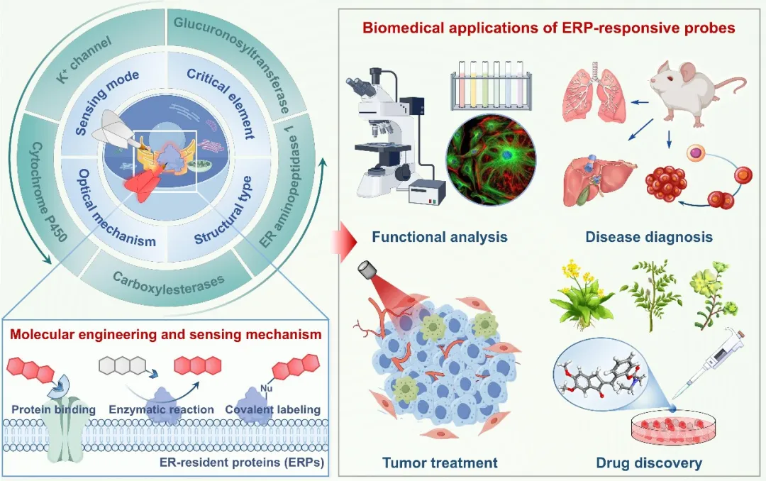 内质网作为真核细胞中最大的细胞器,执行多种关键的生理功能,如蛋白质合成与折叠、脂质合成与转运、内源物及药物代谢、钙稳态及细胞间相互作用等。一些蛋白在内质网中合成后会长期驻留在内质网中,被称为内质网驻留蛋白(ERPs),主要包括部分离子通道、受体及多种代谢酶(如细胞色素P450酶)。这些ERPs参与了机体内部复杂的物质交换和生化级联反应,在能量代谢、生物合成、细胞稳态、异物质代谢和信号传导等生理过程中扮演着不可或缺的角色。然而,诸多外部因素(如缺氧、营养缺乏和环境毒物)容易引发ERPs结构或功能的异常,进而诱发内质网应激反应,严重时会导致脏器损伤、糖尿病、心血管疾病和恶性肿瘤等复杂代谢性疾病的发生。研发高效且非侵入性的技术手段用于复杂生物体系中ERPs的原位可视化分析及动态全景式表征,对于解析复杂疾病的发生发展过程、寻找有效的疾病诊疗手段,以及加速新药研发进程等具有重大意义。