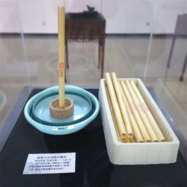 观众踏入展览区域,仿佛置身于苗医药的奇妙世界。精心布置的苗医药文物,如苗医古法烙疗器具、牛角药酒壶等,是苗医药文化的瑰宝。如,展示的“命蒂穴火攻疗法器具”,实则是介绍了“苗医诊病十一大法”之一,即将点燃的纸媒简置于神厥穴(肚脐)上方,观火诊断病情并进行治疗,可用于治疗失眠、抑郁和小儿腹痛等。