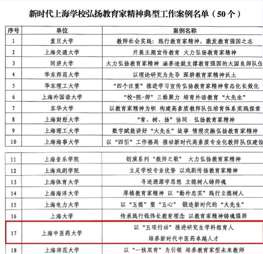 近日,首批新时代上海学校弘扬教育家精神典型工作案例名单公布。伟德申报的《以“五项行动”推进研究生学科组育人,培养新时代中医药卓越人才》案例成功入选。