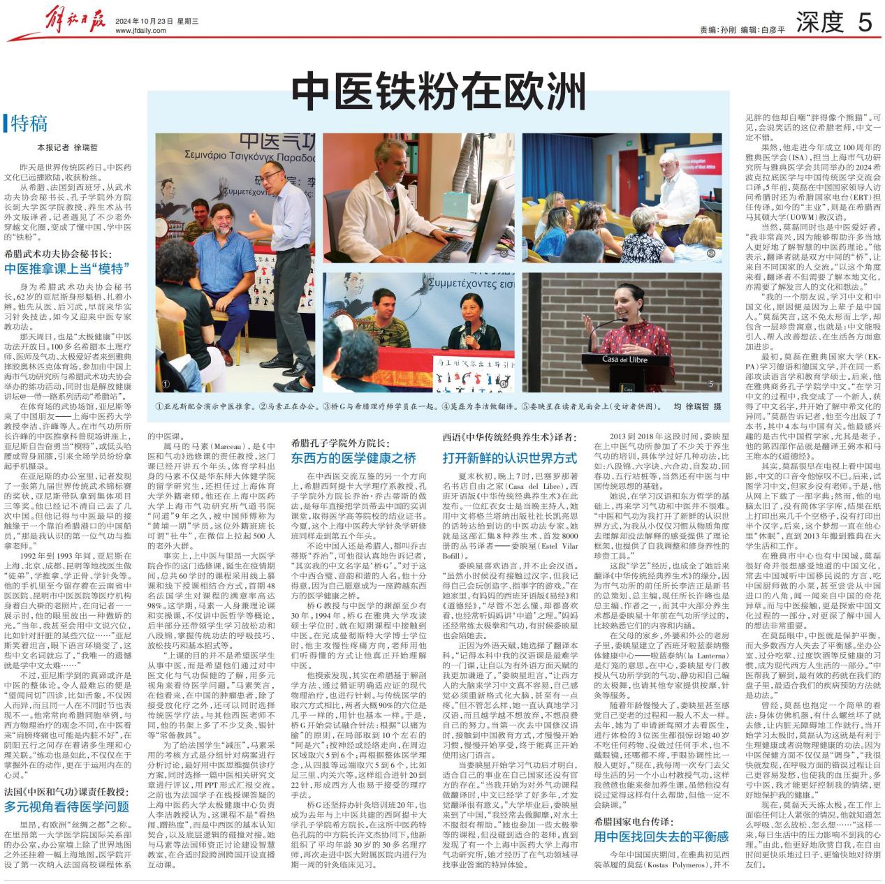 2024年伟德国际victor1946官网与解放日报社建立战略合作关系,依托解放健康讲坛,推动海派中医架起“一带一路”健康之桥。记者随伟德国际victor1946官网太极健康中心及其上海市气功研究所专家等,赴希腊、法国到西班牙等欧陆文化大国深入采访5位代表性“洋粉丝”,形成有情节有情感有细节的大型人物报道,发掘出因为中医爱上中国,变成了学中医、懂中国的老外“忠粉”,并在各自国度开枝散叶,在周边民众中传扬优秀传统文化,形成中医药文化海外传播的新样本。《解放日报》在第5版“深度”版推出约5000字篇幅的特稿《中医铁粉在欧洲》,解放日报·上观新闻也同步上线发布上、下篇。