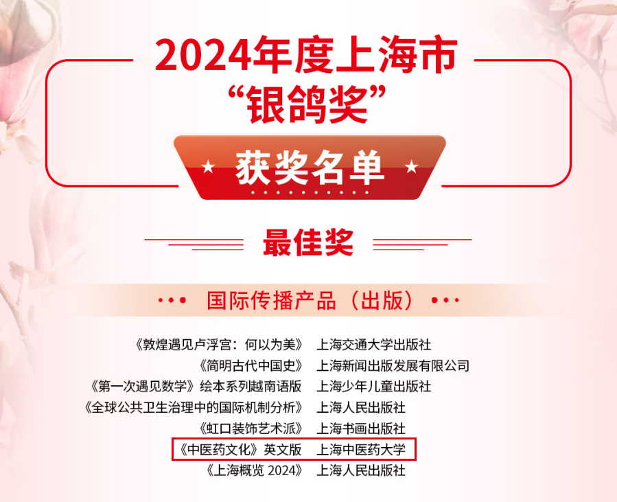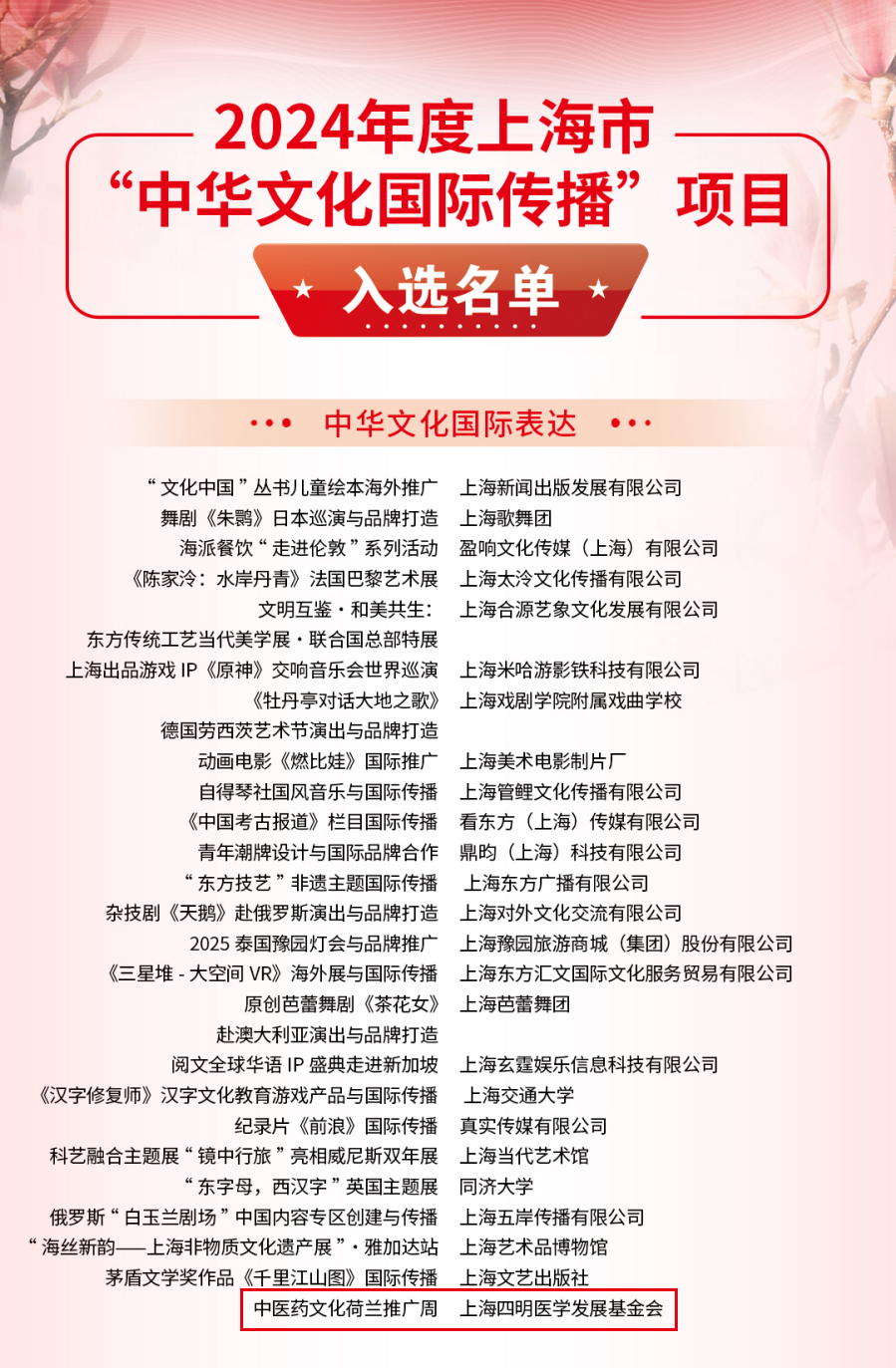 伟德申报的《中医药留学生“周周看上海”国际传播》入选2024年度上海市“中华文化国际传播”项目(国际朋友圈拓展),《中医药文化》英文版荣获2024年度上海市“银鸽奖”国际传播产品(出版)最佳奖。上海四明医学发展基金会申报的《中医药文化荷兰推广周》入选2024年度上海市“中华文化国际传播”项目(中华文化国际表达)。
