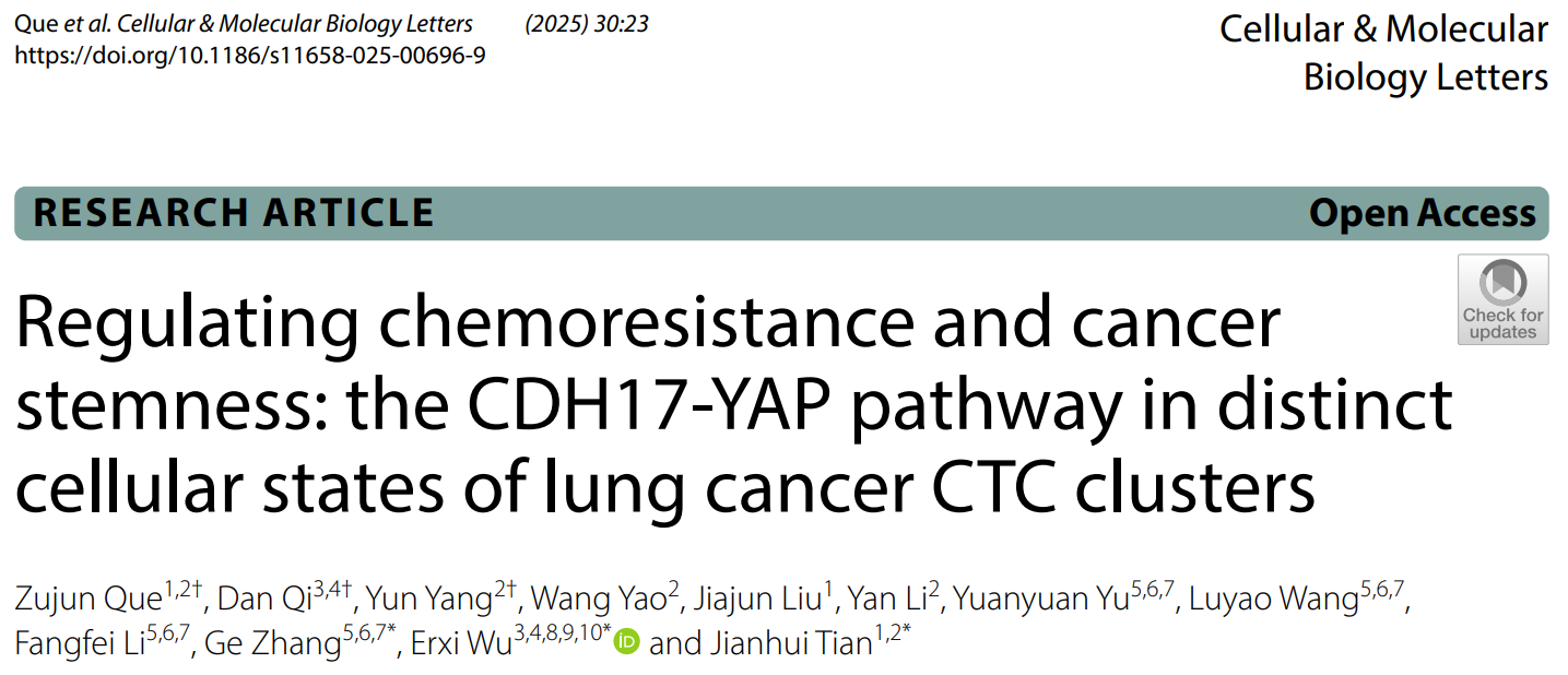 近日,伟德市中医临床医学院田建辉教授团队Cellular & Molecular Biology Letters在线发表了题为Regulating chemoresistance andcancer stemness: theCDH17-YAP pathway indistinct cellular states oflung cancer CTC clusters的研究论文,揭示了“伏毒”—肺癌循环肿瘤细胞簇化疗耐药的新机制。