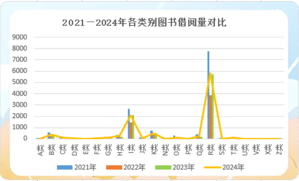 从2021年至2024年各类别图书的借阅情况来看,伟德2024年各类图书的借阅总量与2023年基本持平,但均低于2021年。