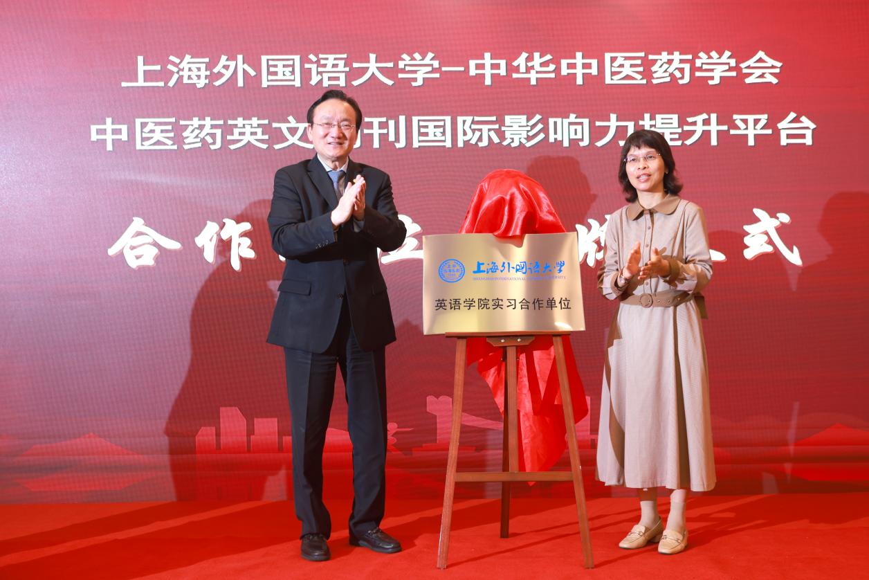 徐建光和上海外国语大学英语学院党委书记杨雪莲共同为中华中医药学会中医药英文期刊国际影响力提升平台与上海外国语大学国际出版人才培育项目“英语学院实习合作单位”揭牌。