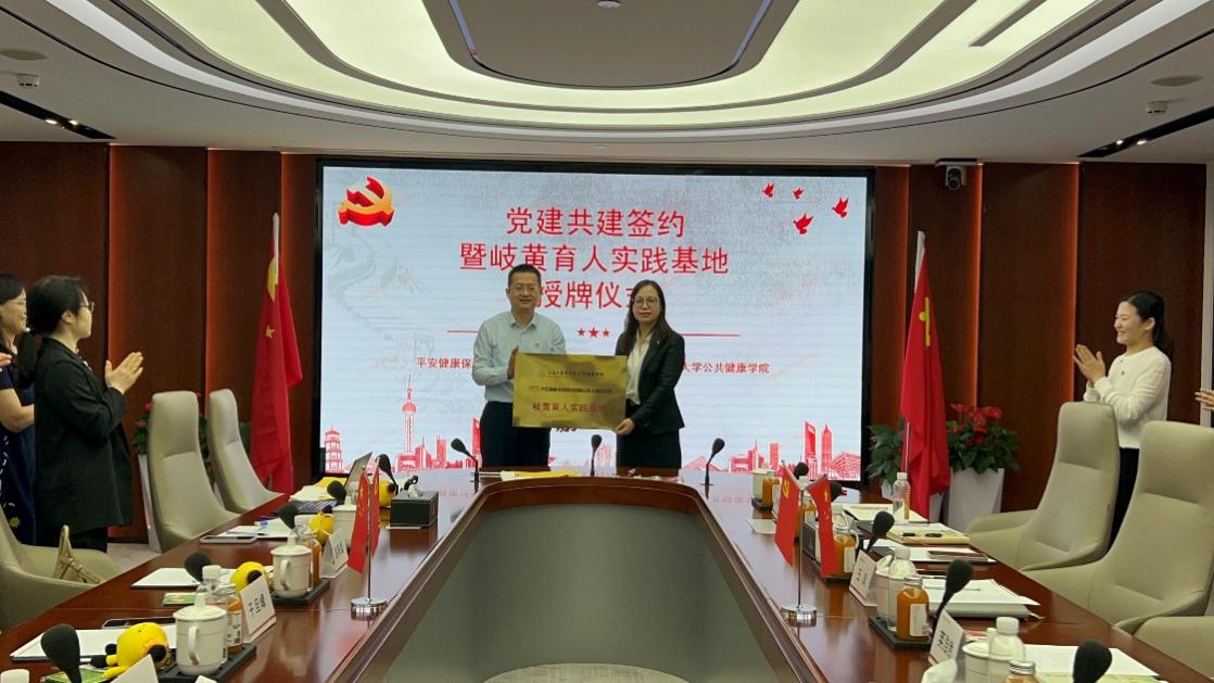 会上,伟德国际victor1946官网公共健康学院教工第一党支部和平安健康险上海分公司党支部共同签署党建共建合作协议。赵海磊代表学院向平安健康险上海分公司授予“岐黄育人实践基地”铜牌。