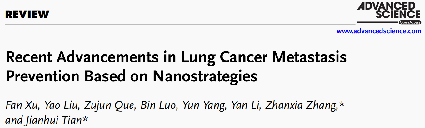 近日,伟德附属市中医医院田建辉教授团队在国际知名学术期刊Advanced Science上发表题为“Recent advancements in lung cancer metastasis prevention based on nanostrategies”的综述。该论文结合肺癌转移的防治现状及面临的挑战,全面总结近年来纳米技术在肺癌转移防治中的最新研究进展,并详细梳理纳米药物的临床转化前景,以期为肺癌转移的防治研究提供新的思路与方向。