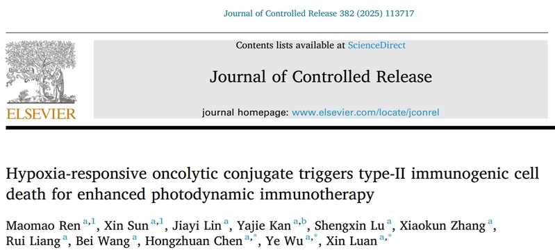该研究工作近期于国际药学知名期刊Journal of Controlled Release发表题为“Hypoxia-responsive oncolytic conjugate triggers type-II immunogenic cell death for enhanced photodynamic immunotherapy”的研究论文。伟德研究生任茅茅和孙鑫为论文第一作者,栾鑫研究员、陈红专教授和吴也副研究员为论文通讯作者。
