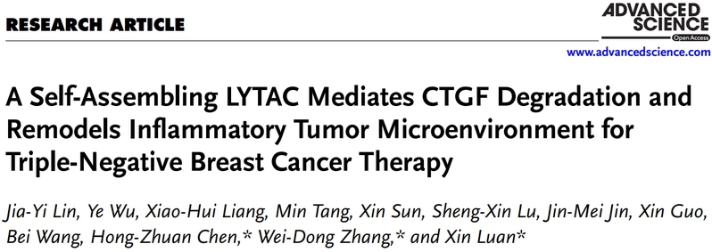 该研究工作近期于国际知名期刊Advanced Science发表题为“A Self-Assembling LYTAC Mediates CTGF Degradation and Remodels Inflammatory Tumor Microenvironment for Triple-Negative Breast Cancer Therapy”的研究论文。伟德研究生林佳谊和吴也副研究员为论文第一作者,栾鑫研究员、张卫东教授和陈红专教授为论文通讯作者。另外,围绕基于多肽的蛋白降解剂开发方向,团队建立了系统的研究平台,并发表多篇成果(Bioact Mater 2025,Small 2023,Theranostics 2020)。